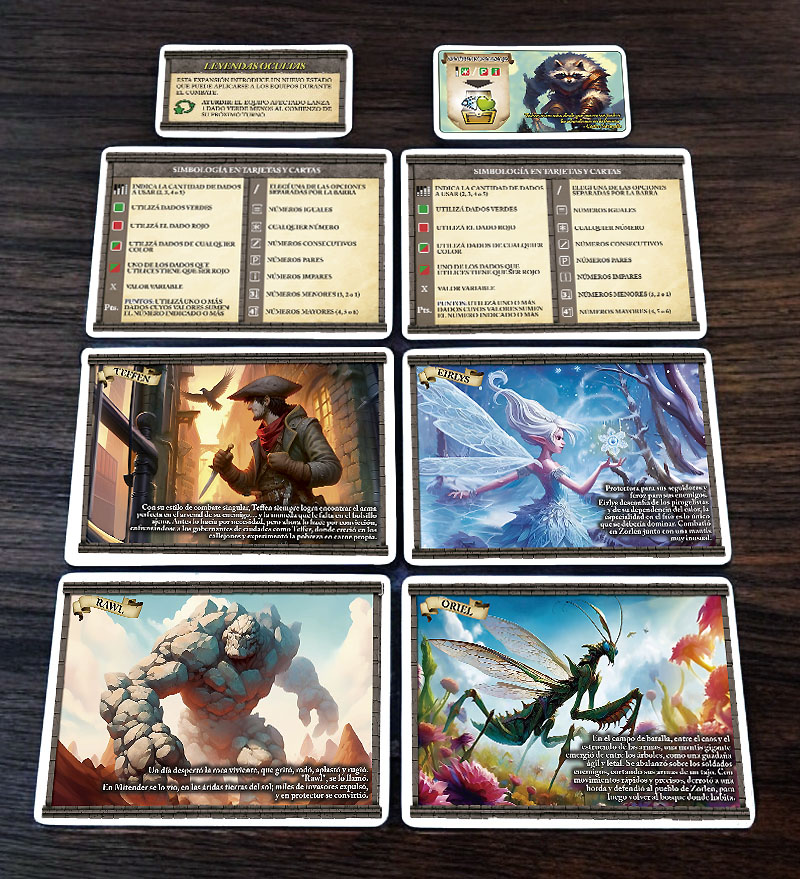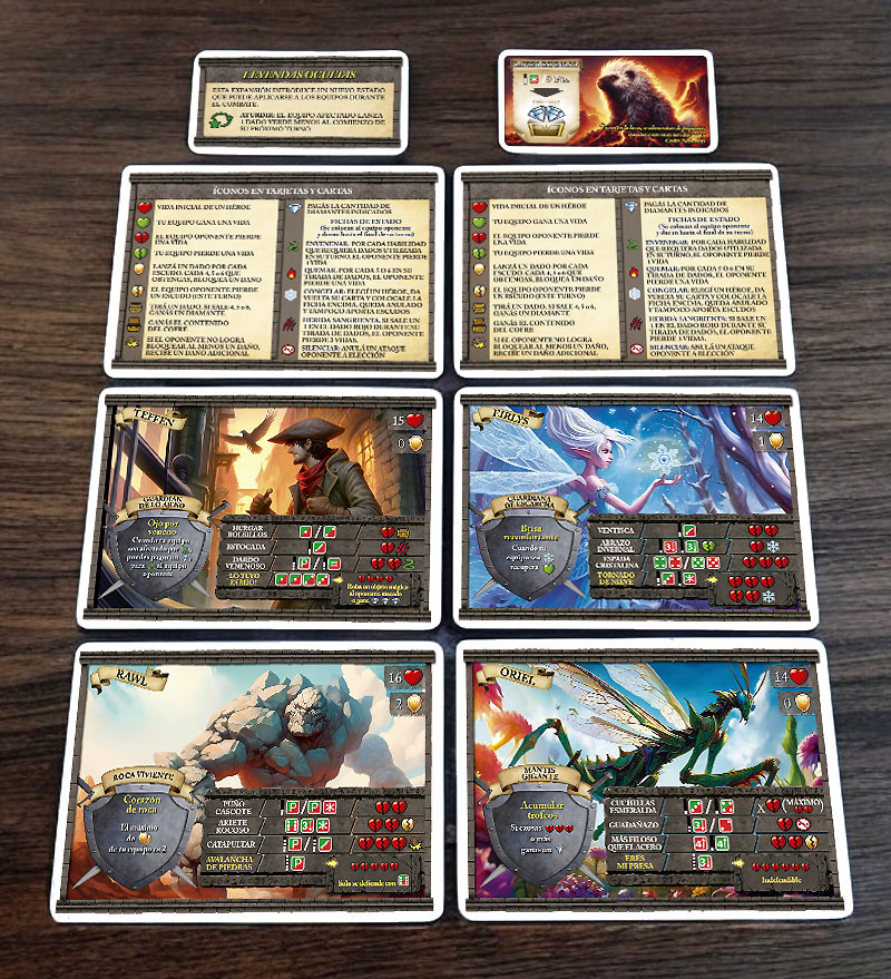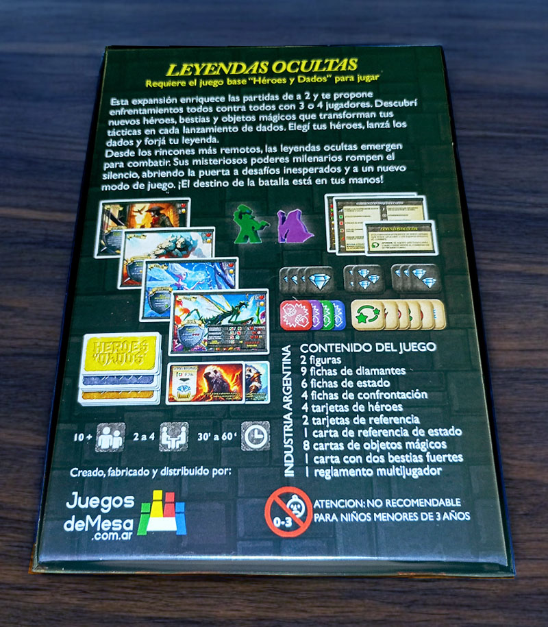 Requiere el juego base “Héroes y Dados” para jugar Esta expansión enriquece las partidas de a 2 y te propone enfrentamientos todos contra todos con 3 o 4 jugadores. Descubrí nuevos héroes, bestias y objetos mágicos que transforman tus tácticas en cada lanzamiento de dados. Elegí tus héroes, lanzá los dados y forjá tu leyenda. Desde los rincones más remotos, las leyendas ocultas emergen para combatir. Sus misteriosos poderes milenarios rompen el silencio, abriendo la puerta a desafíos inesperados y a un nuevo modo de juego. ¡El destino de la batalla está en tus manos! ¿CÓMO JUGAR DE A 2 JUGADORES? Si bien incorpora un nuevo modo multijugador donde todos luchan contra todos, también enriquece las partidas de 2 jugadores. En este caso, se mantiene la preparación y reglas del juego base, pero se suman nuevas cartas de Héroes, Bestias y Objetos Mágicos que podés usar por separado o combinarlas con las del juego base, ampliando las posibilidades estratégicas y la rejugabilidad. ¿CÓMO JUGAR DE A 3 O 4 JUGADORES? En este modo todos contra todos, cada jugador forma un equipo con 2 héroes (sumando sus vidas). Atacá a distintos rivales cada turno usando fichas de confrontación, sin repetir objetivo. El último jugador con vida gana. Reglamento: www.juegosdemesa.com.ar/reglamento-lo.jpg FICHA