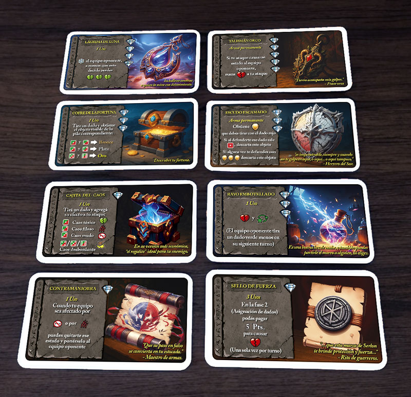 Autores: Agustín Czyrka y Juan Czyrka Ilustrador: Agustín Czyrka Duración de Partida: entre 30 a 60 minutos Cantidad de Jugadores: 2 a 4 Edad Recomendada: 10 años en adelante COMPONENTES: 2 figuras 9 fichas de diamantes 6 fichas de estado 4 fichas de confrontación 4 tarjetas de héroes 2 tarjetas de referencia 1 carta de referencia de estado 8 cartas de objetos mágicos 1 carta con dos bestias fuertes 1 reglamento multijugador |